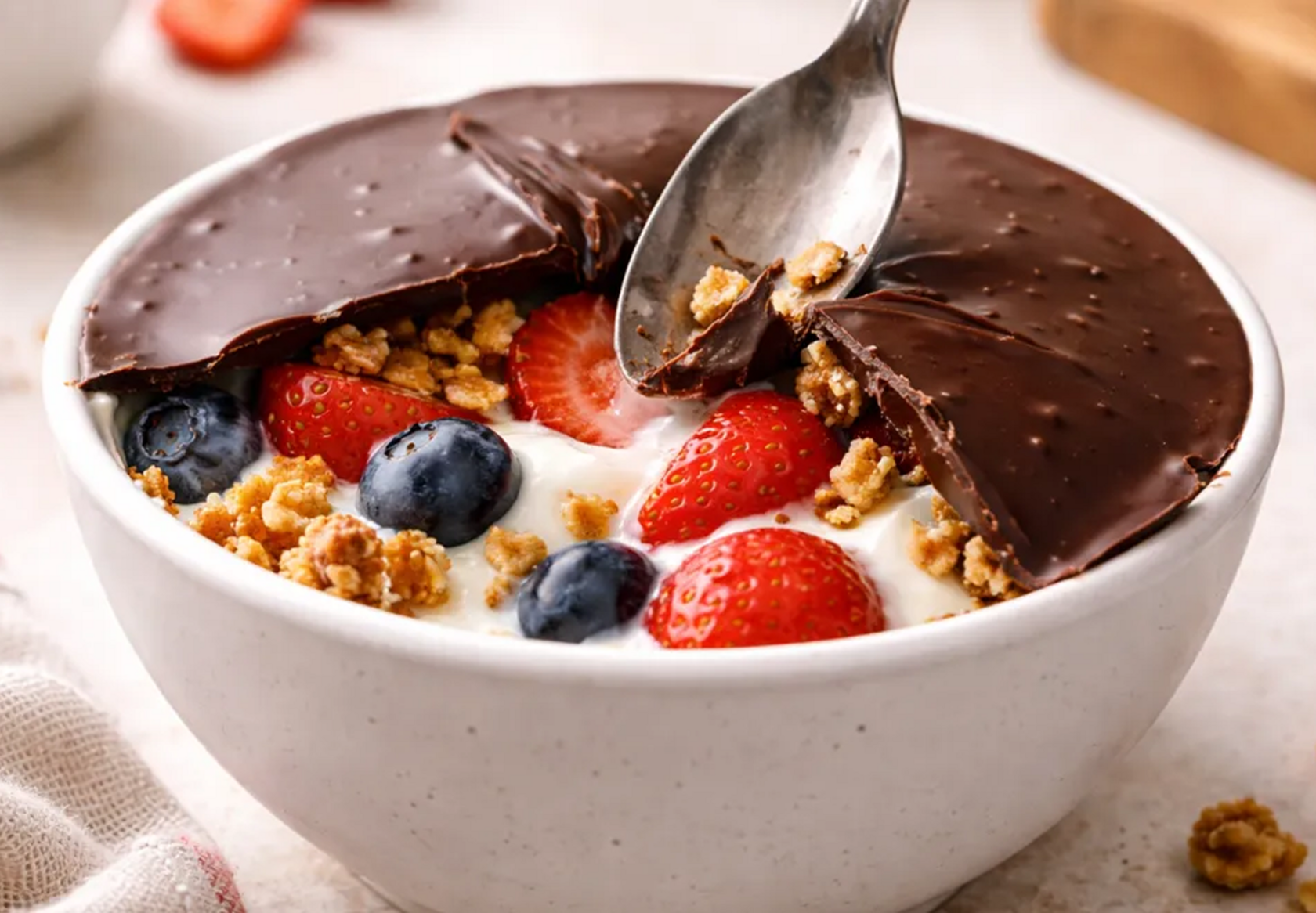 - Вылейте растопленный шоколад на йогуртовую смесь и слегка покрутите емкость, чтобы шоколад равномерно покрыл поверхность. Посыпьте солью и уберите в морозилку на 5–10 минут.